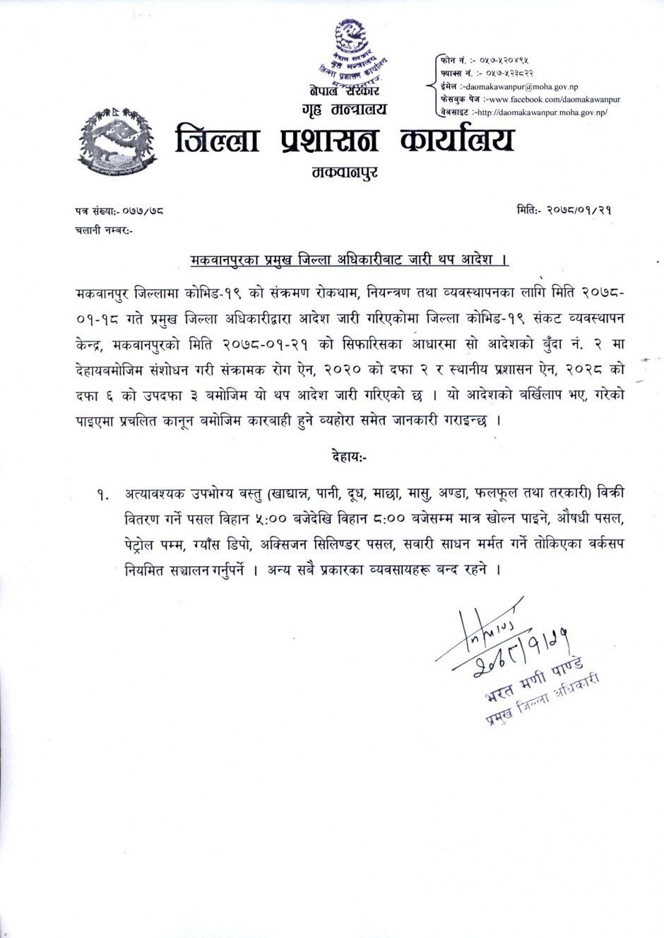 मकवानपुर । हेटौंडा बजार क्षेत्रका दैनिक अत्यावश्यक पसलहरु खुल्ने समय स्थानीय प्रशासनले घटाएको छ । कोरोना संक्रमणको मध्यनजर गर्दै जिल्ला प्रशासन कार्यालय मकवानपुरले आज एक सूचना जारी गर्दै जिल्लामा अत्यावश्यक उपभोग्य वस्तु पसल विहान ५ बजेबाट ८ बजेसम्म ३ घण्टा मात्रै खुल्न दिने निर्णय गरेको छ ।