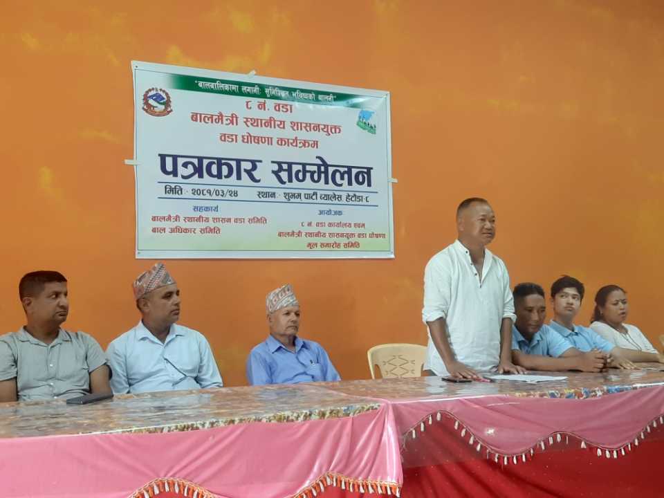 मकवानपुर । हेटौंडा उपमहानगरपालिकाको वडा नम्बर–८ बालमैत्री स्थानीय शासनयुक्त वडा हुने भएको छ । आउँदो असार २९ गते उपमहानगरकै पहिलो बालमैत्री स्थानीय शासनयुक्त वडा घोषणा हुने आज पत्रकार सम्मेलन मार्फत जानकारी गराईएको थियो । बालमैत्री शासनयुक्त वडा घोषणा गर्नका लागि ५१ वटा सुचकहरु पूरा गरिसकेकाले घोषणा गर्न लागिएको सहजकर्ता रोजिता दंगालले जानकारी बताएकी छिन् । वडा नम्बर ८ भित्र १९ वटा टोल विकास संस्था र २१ वटा बाल समूह रहेका छन् ।