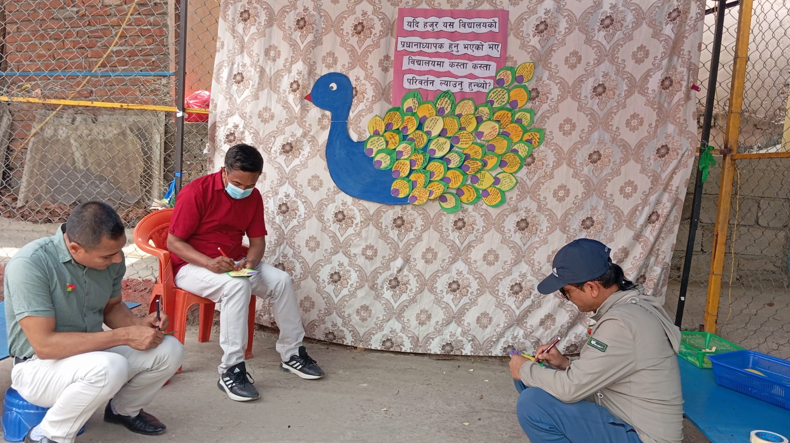 वार्षिकोत्सवका अवसरमा विद्यालयले आगन्तुकहरूका सुझाव संकलन गर्न राखेका स्टलमा लिखित सुझाव दिँदै अतिथिहरू