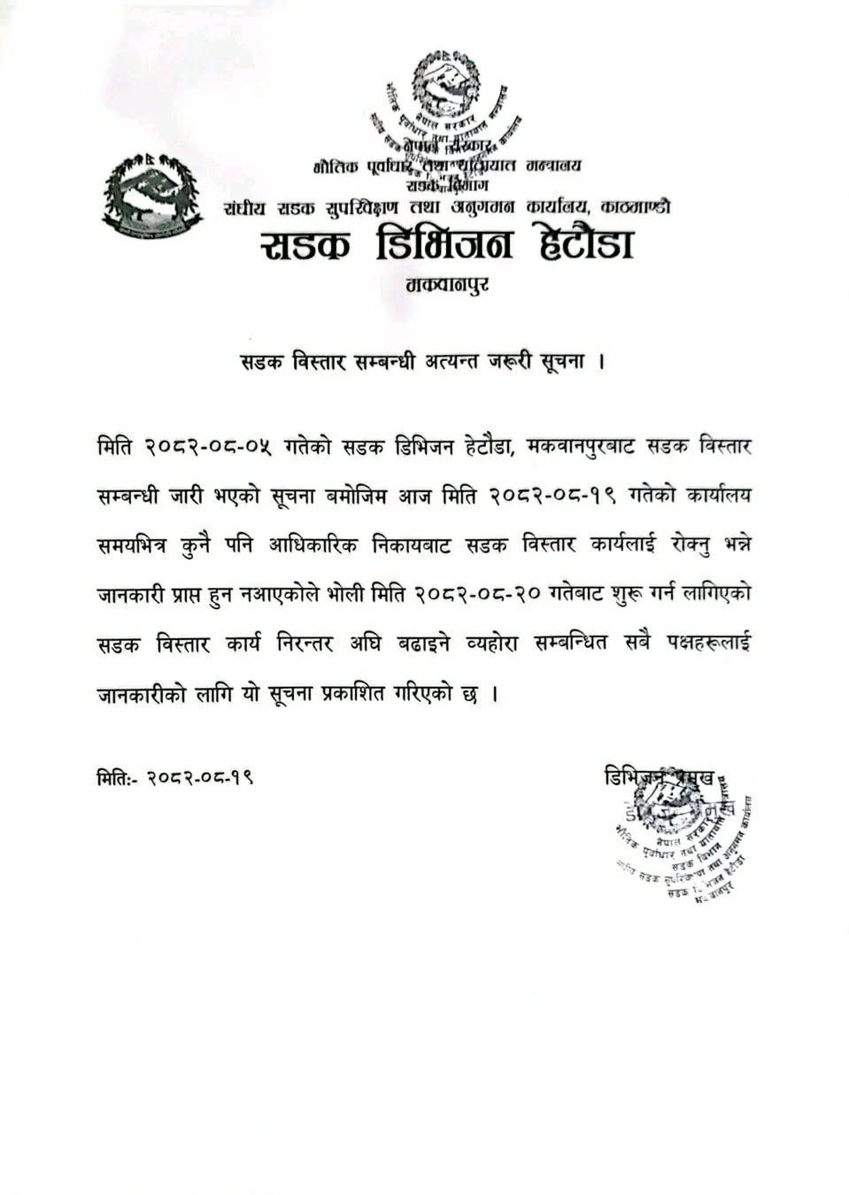 सडक डिभिजन कार्यालय हेटौंडाले सडकको दायाँबायाँ २५/२५ मिटर विस्तारका लागि घरटहरा हटाउन २०७६, २०८० मा पटकपटक सूचना जारी गर्ने गरेको थियो । तर स्थानीय घरधनीहरुले त्यस विरुद्ध अदालतबाट स्टेअर्डर ल्याउनाले सडक विभाग पछि हटेको थियो । २०७३ सालबाट अझ पेचिलो बन्दै गएको सडक विस्तारको कार्य उपर गत २०८० पुष १७ गते सर्वोच्च अदालतका न्यायाधीश सुनिलकुमार पोखरेलको इजलाशले हेटौंडा बजारको ९.५ किलोमिटर क्षेत्रभित्र पर्ने सडकको दायाँबायाँ २५/२५ गज (७५ फिट) राष्ट्रिय राजमार्गभित्र पर्ने भएकाले मुआब्जा, क्षतिपूर्ति दिन नपर्ने आदेश दिएको थियो । आदेशसँगै सडकविभागले गत मङसीर ५ गते १५ दिने सूचना जारी गर्दै हेटौंडामा त्रिभुवन राजपथको रातोमाटेदेखि सामरीपुलसम्म र महेन्द्र राजमार्गको बुद्धचौकदेखि राप्तिपुलसम्मको क्षेत्रका घरटहरा हटाउन सार्वजनिक सूचना जारी गरेको थियो । सूचनाको समयावधि हिजो शुक्रबार राति १२ बजेपछि सकिएसँगै सडक डिभिजन कार्यालयले विहान ५ बजेबाट ती क्षेत्रका ५३१ घर टहरा हटाउन लागेको छ । २०७३ सालदेखि ३४३ वटा मुद्दा परेका थिए । डिभिजन प्रमुख गुरुप्रसाद अधिकारीका अनुसार २०२१ सालको राजमार्ग व्यवस्था ऐन र २०३४ सालको रापत्रको सूचना अनुसार यस क्षेत्रलाई राष्ट्रिय राजमार्ग घोषणा गरिसकेको बताएका छन् ।