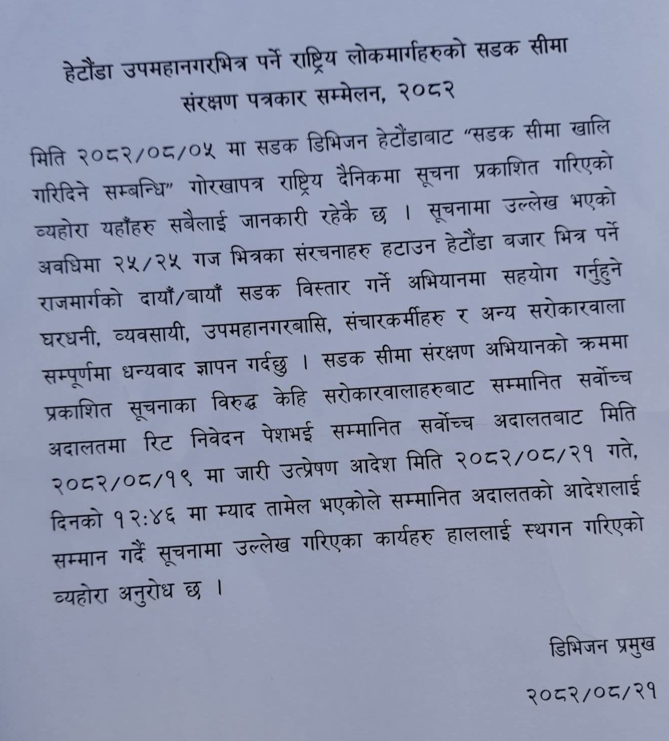 सडक डिभिजन कार्यालयले सर्वोच्च अदालतकै २०८० पुष १७ गतेको न्यायाधिश सुनिलकुमार पोखरेलको आदेशले सडकको दायाँबायाँ २५÷२५ गज सडक सीमा रहेको व्याख्या अनुरुप हिजोबाट सडक विस्तार कार्य अघि बढाएको थियो ।